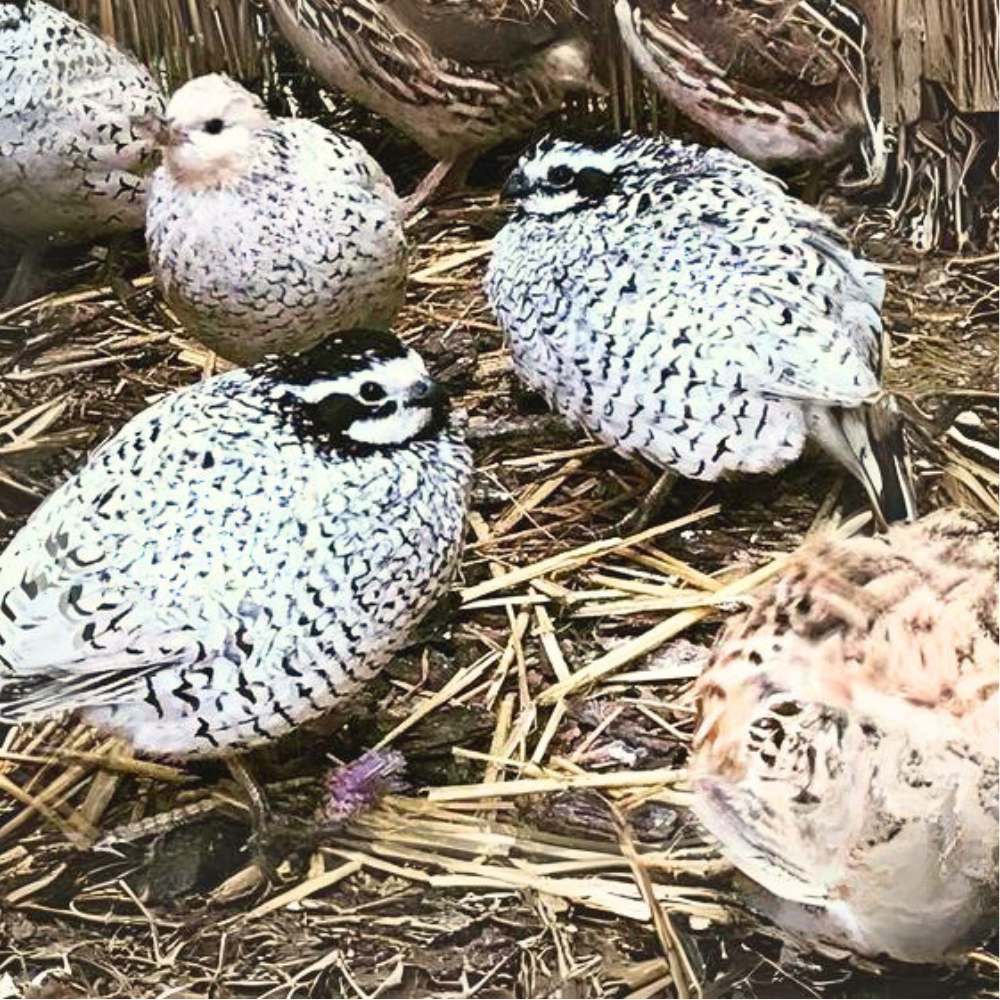 Snowflake Bobwhite Quail is a striking variation of the Mexican Speckled Bobwhite, characterized by its unique bright white color and bold black markings. This rare breed sets itself apart from the more common gold-toned and darkly marked Mexican Speckled Bobwhite.