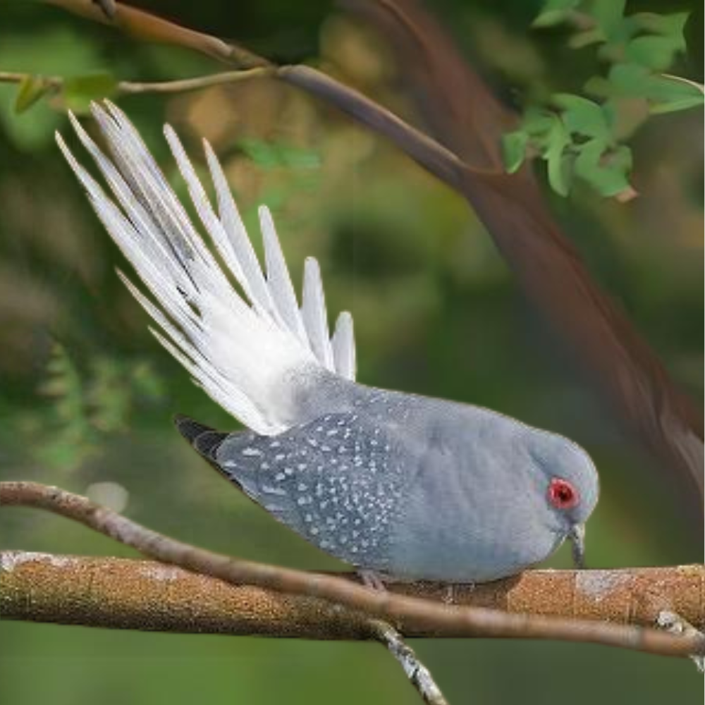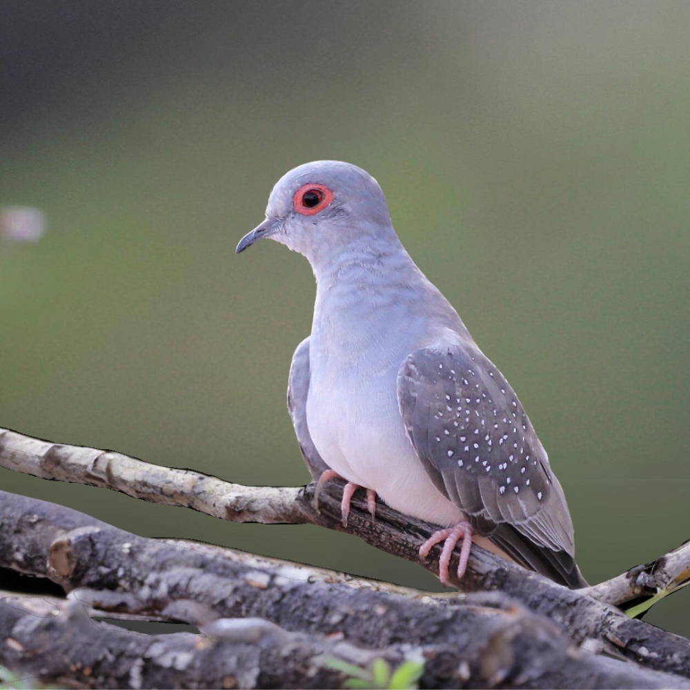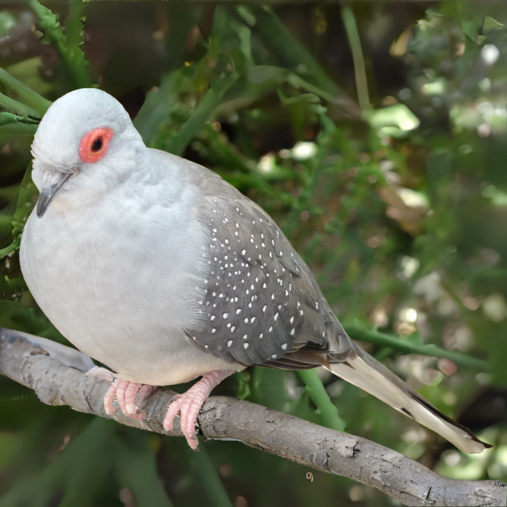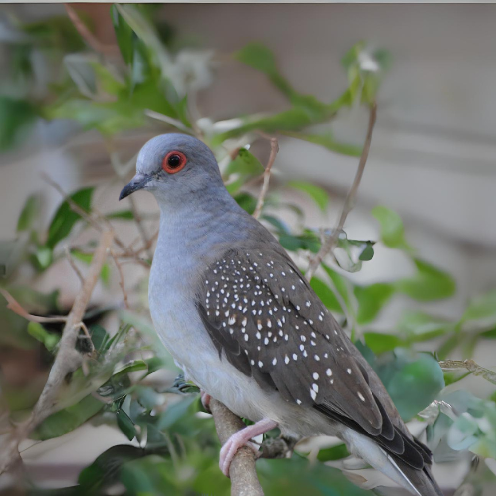 While their lengths range from 19-21 centimeters or 9-11 inches, Diamond Doves are small birds with white spots and black edges on their wings, red eyes, and orange eye-rings regardless of sex. Although males and females are similar in appearance, the female's plumage has a less vivid eye ring and more brown coloring. The male features a light blue-grey head, neck, and breast, a dark grey bill, and a brown-grey back and tail. Their legs and feet are pink. Juveniles have a light grey bill, fawn-colored iris and eye ring, grey feet and legs, and a grey breast without white wing spots.
