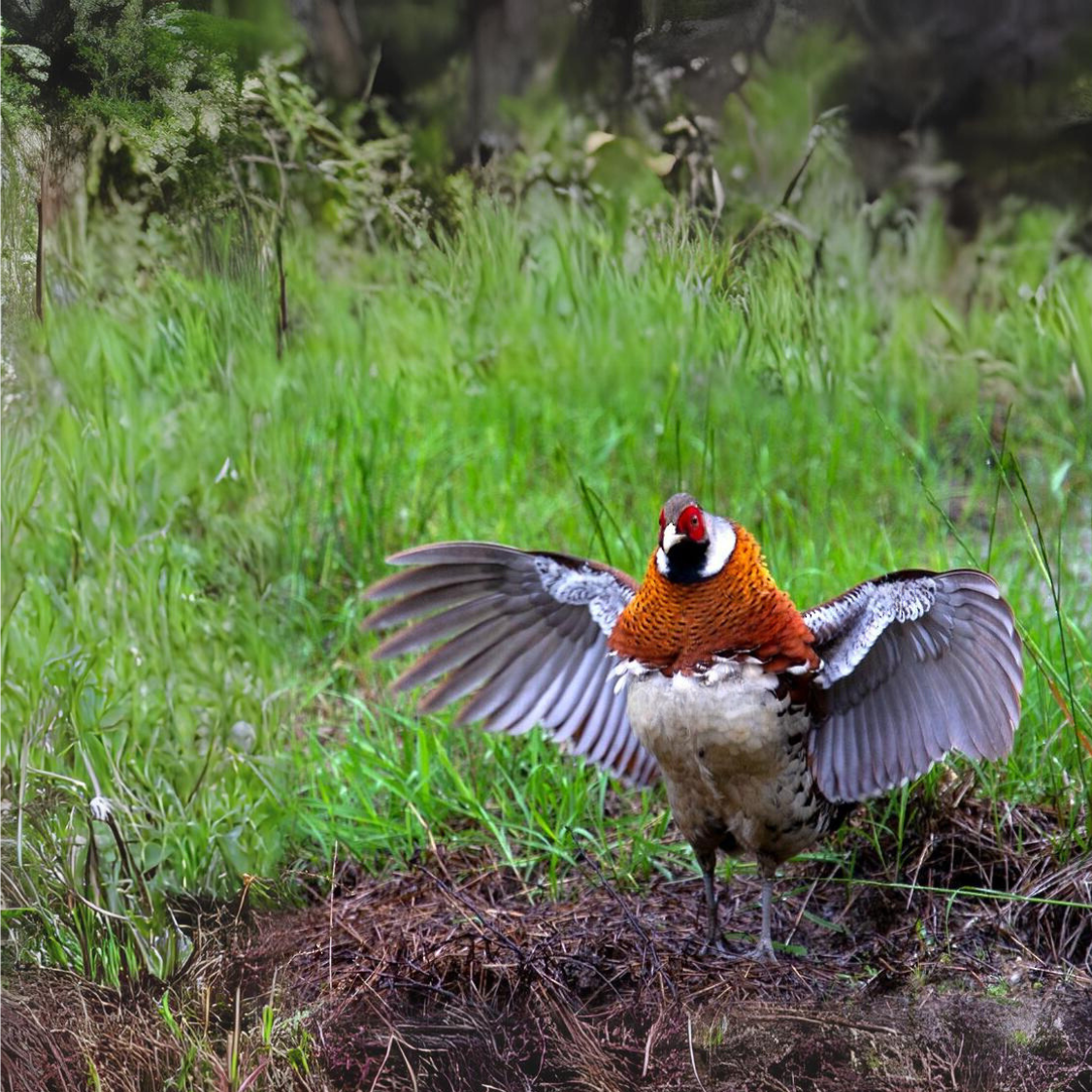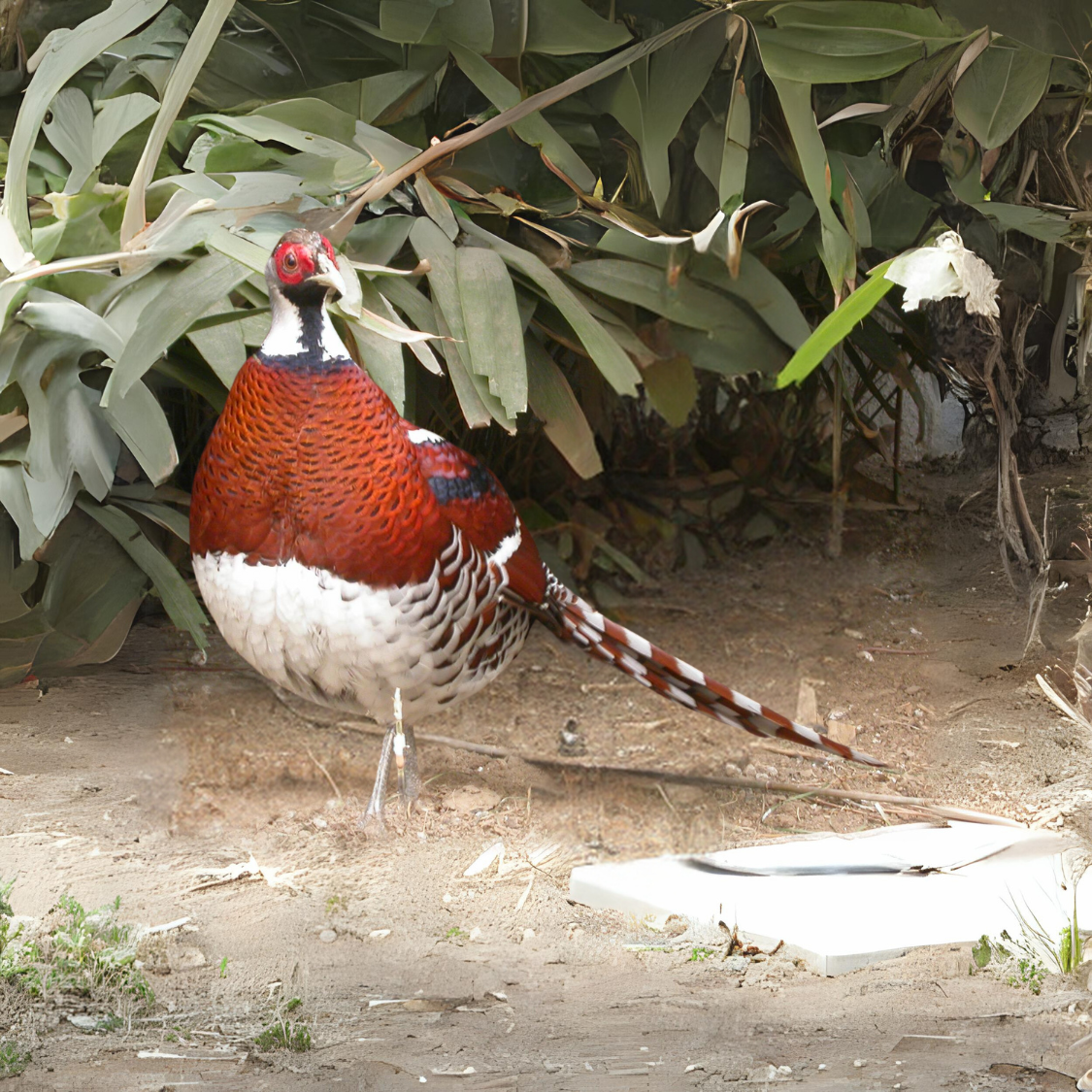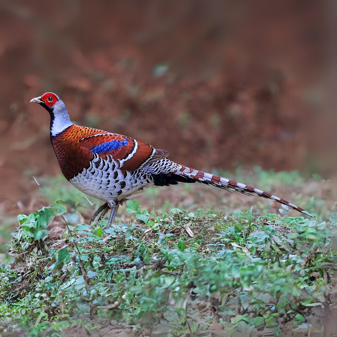 Both male and female Elliot's Pheasants possess distinct physical characteristics. Males can reach a length of 80 cm (31 in) and feature a combination of brown and white feathers, along with a black throat, chestnut-brown upper body, white belly, nape, and wing bars. Their facial skin is a vibrant red and their long, whitish tail is striped with rusty bars. Females, on the other hand, are smaller in size, measuring around 50 cm (20 in) in length. They have rufous brown feathers, a blackish throat, whitish belly, and less prominently barred tail.