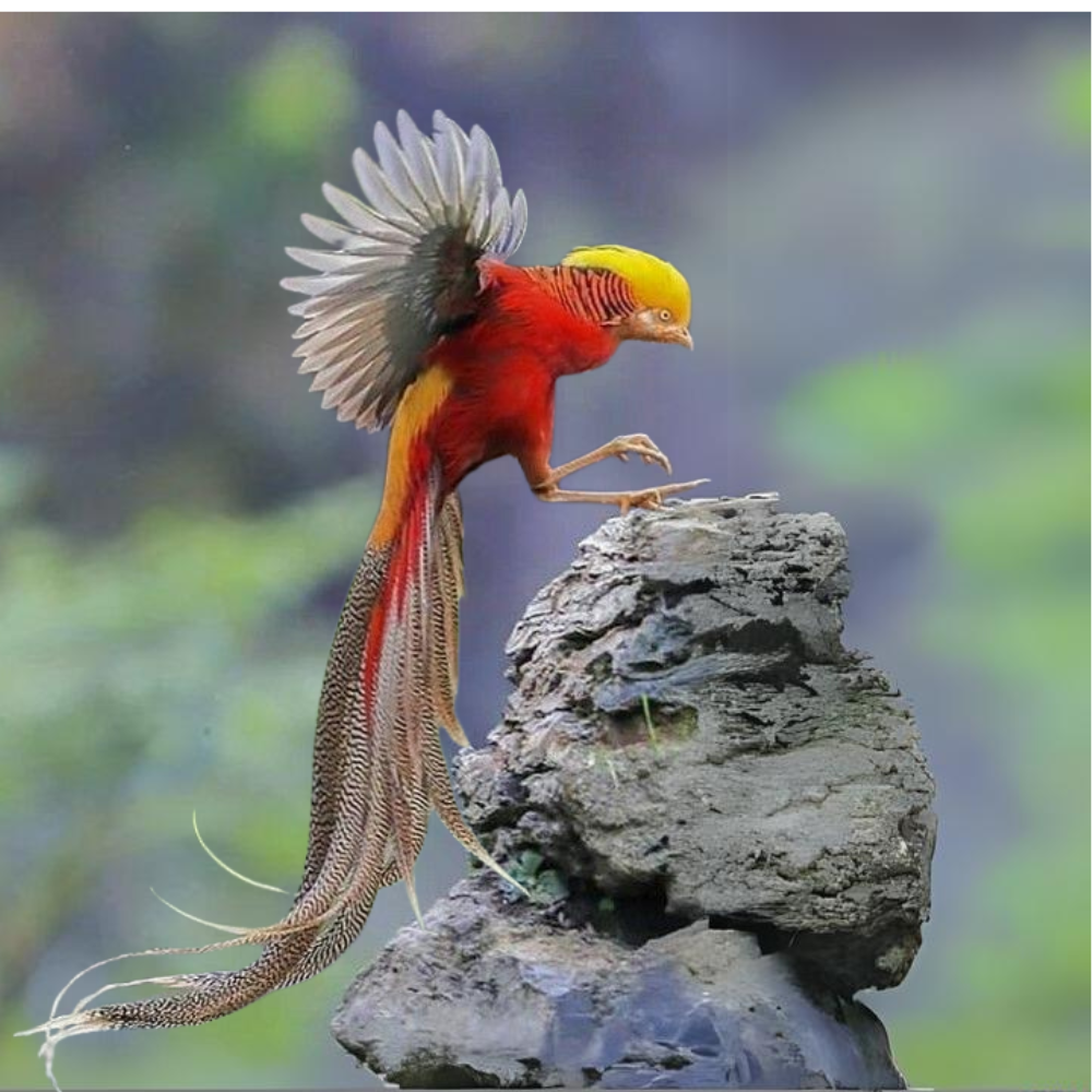 The adult male of the Red Golden Pheasant measures about 100 cm (39 in) in length, with its tail comprising two-thirds of the total length. It weighs between 500-700 g (1-2 lb) and boasts a striking coloration with a golden crest and rump, as well as a bright red body. The male also has an orange ruff or "cape" on its back, which can be displayed to reveal an eye-catching alternating pattern of black and orange. The eye itself is a bright yellow with a small black pupil. The face, throat, chin, and sides of the neck are all a rusty tan color, while the wattles and orbital skin are a sunny yellow. The upper back is a vibrant green, while the rest of the back and the rump are a golden-yellow hue. The wings have blue tertiary feathers and dark red scapulars, while the central tail feathers are speckled with black and cinnamon and the tip of