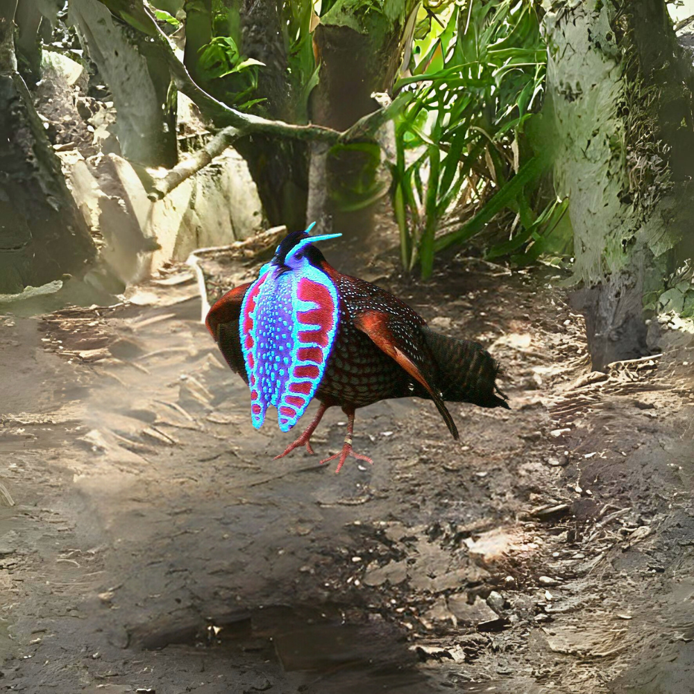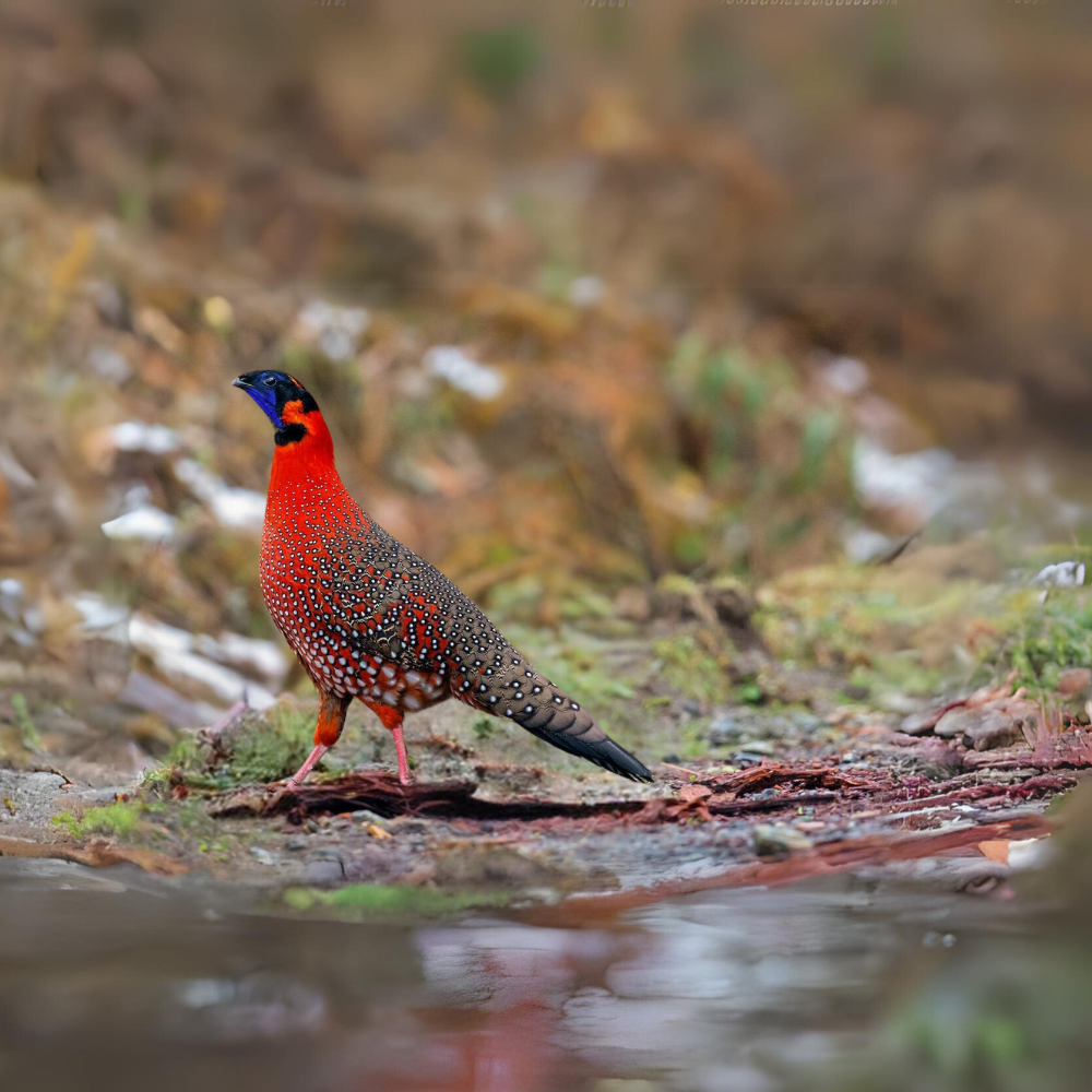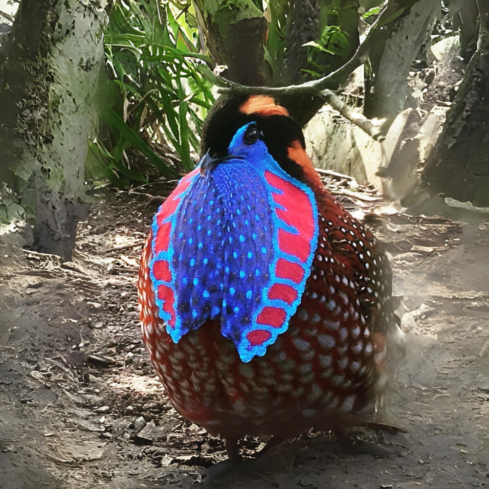 The satin-colored tragopan, also known as the crimson horned pheasant, is a type of pheasant found in the lush woodlands of the Indian, Tibetan, Nepalese, and Bhutanese regions within the Himalayas. These birds typically inhabit moist forests with an abundance of oak and rhododendron trees, as well as dense undergrowth and clusters of bamboo. They are commonly found at altitudes of 2400 to 4200 meters during the summer and 1800 meters during the winter season. The male tragopan can reach a total length of approximately 70 cm.